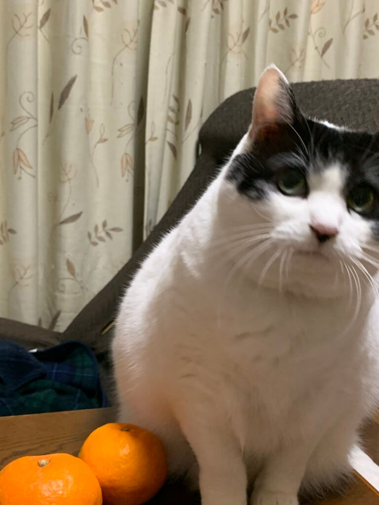 コタツの上のみかんと並ぶジュリア編集長