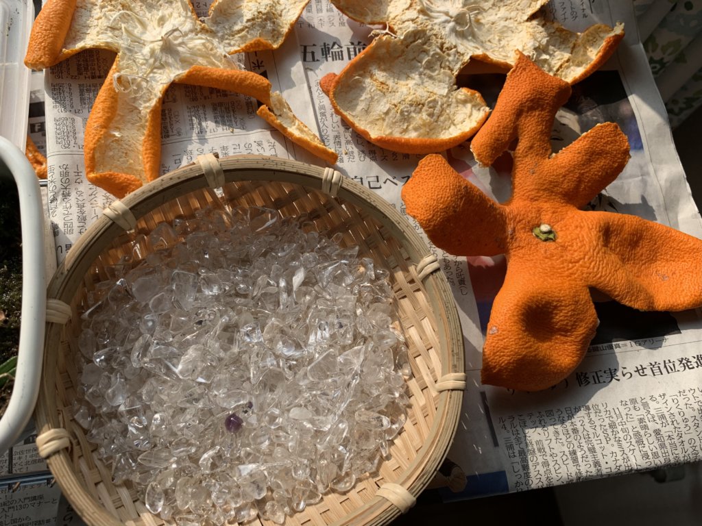 みかんの皮と水晶のさざれ石を日向ぼっこ。